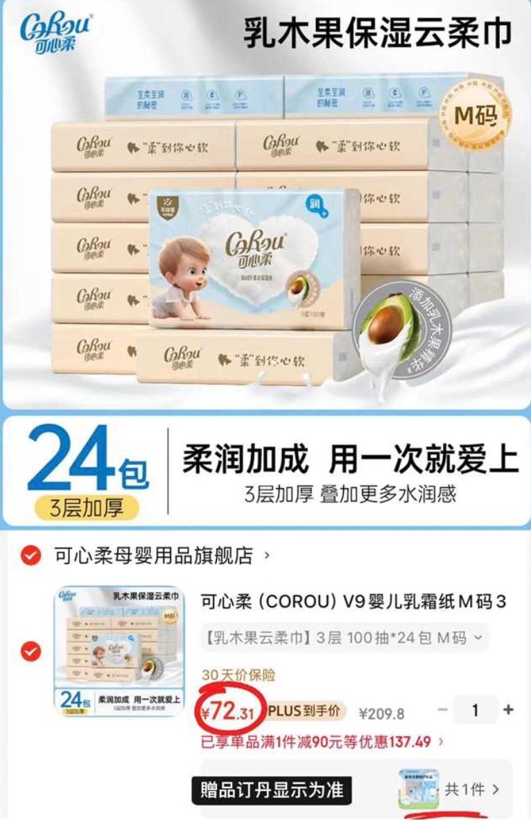 【72.3】可心柔 乳木果云柔巾M碼100抽*24包