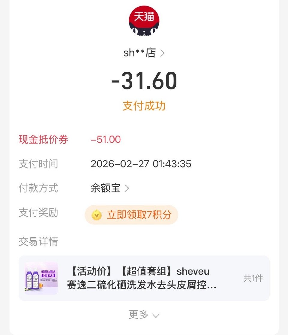 fej做不出来 偶然刷到洗发水很好价 付31.6🍚13 就是tjb 在tb加购可以抵扣18但是不知道为什么跳转zfb只能抵扣几块钱 所以用的猫币