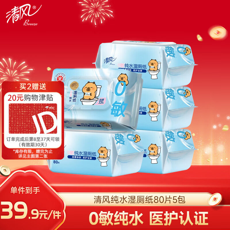 【拍2件43.8】清风 纯水湿厕纸80片*5包*2