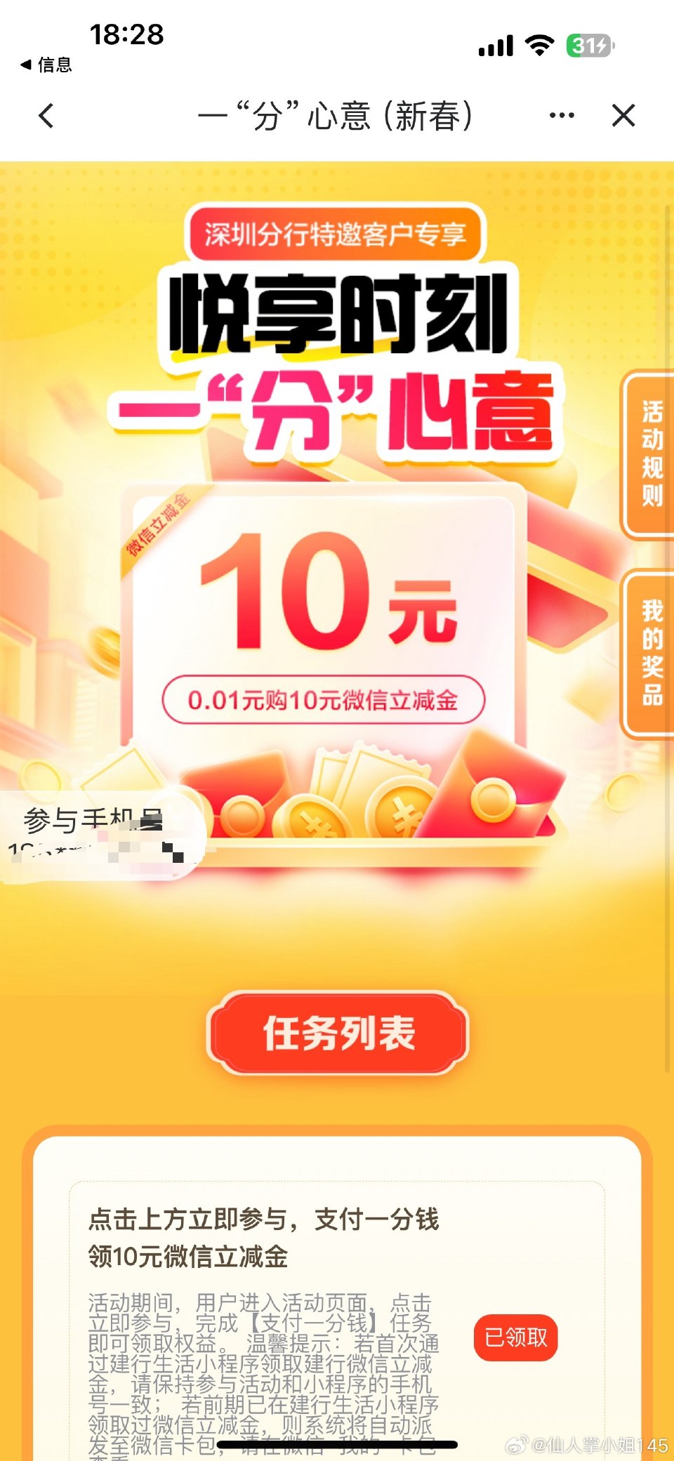 【建设银行】2月25日起至2月28日,支付一分钱,可领10元微信立减金!详请点击s.ccb.cn/s/a/dmj 查看参与。拒收请回复R