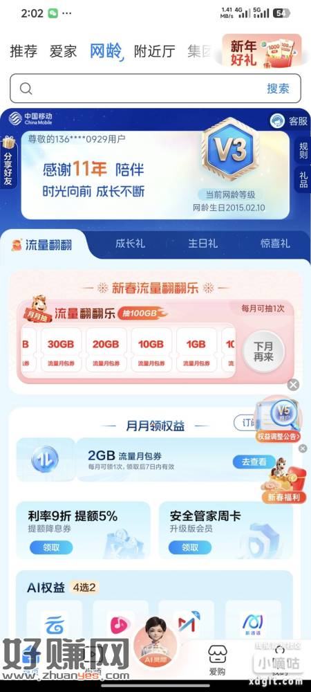 每月网龄里面记得抽和领取2G通用流量