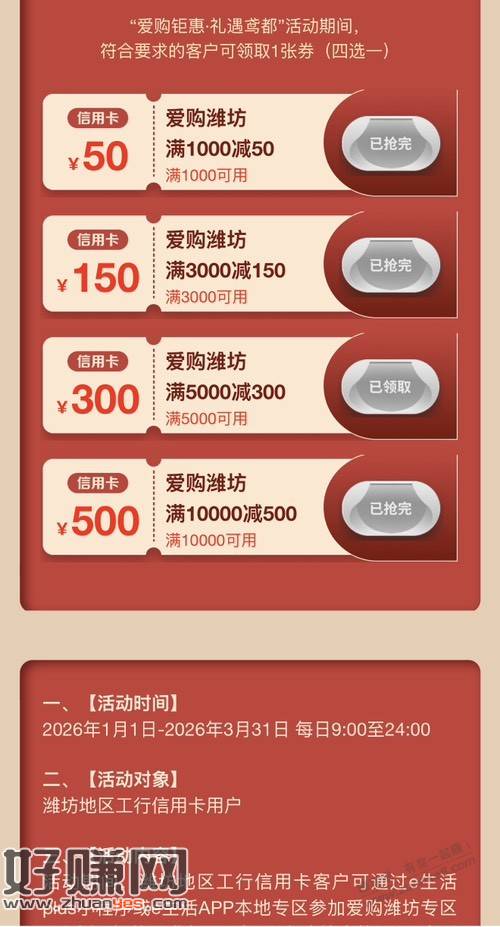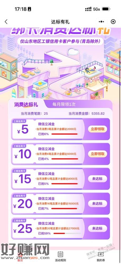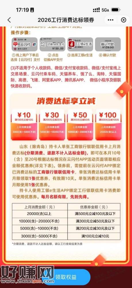 小程序里面每个月各种小刷卡金活动没考虑进去哈 如果3张工行卡每张消费10000,可以得到活动一50元,活动二25元,活动四150元,3w元拿到225元 活动四抢到过一次5000-300,通用的,不过一季度只让领一次
