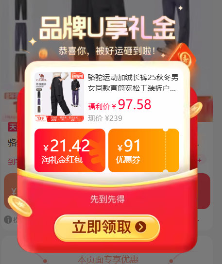 TB【凑单66.33】骆驼.运动加绒工装裤,凑88会员200-25消费券,需要有运动300-20券